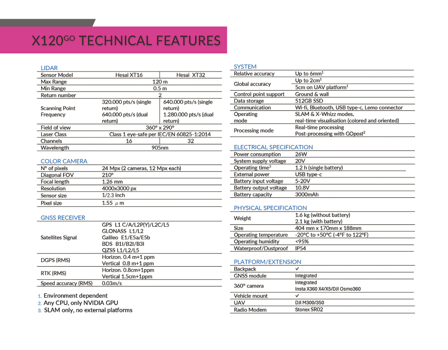 X120GO v2 je najnoviji SLAM skener koji pokriva sve potrebe kupaca. Domet od 0.5 do 120 metara, 320.000/640.000/1.280.000 t/s i rotirajuća glava koja maksimalno povećava pokrivenost laserskom zrakom čine ga prikladnim za svako okruženje. Opremljen s 2 panoramske kamere i integriranim RTK prijemnikom za georeferenciranje oblaka točaka u stvarnom vremenu.