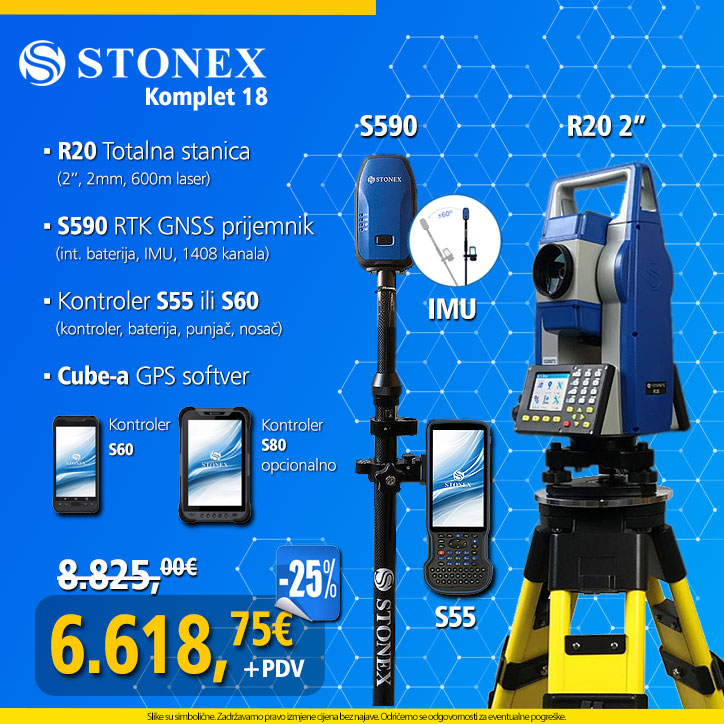 Iskoristi priliku i nabavi  komplet S580+ RTK GNSS i R20 2″ totalnu stanicu po povoljnoj cijeni 25% jeftinije.
