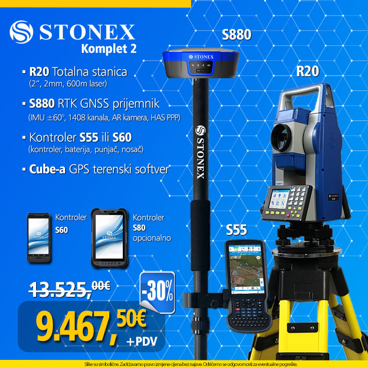Iskoristi priliku i nabavi  komplet S580+ RTK GNSS i R20 2″ totalnu stanicu po povoljnoj cijeni 30% jeftinije.