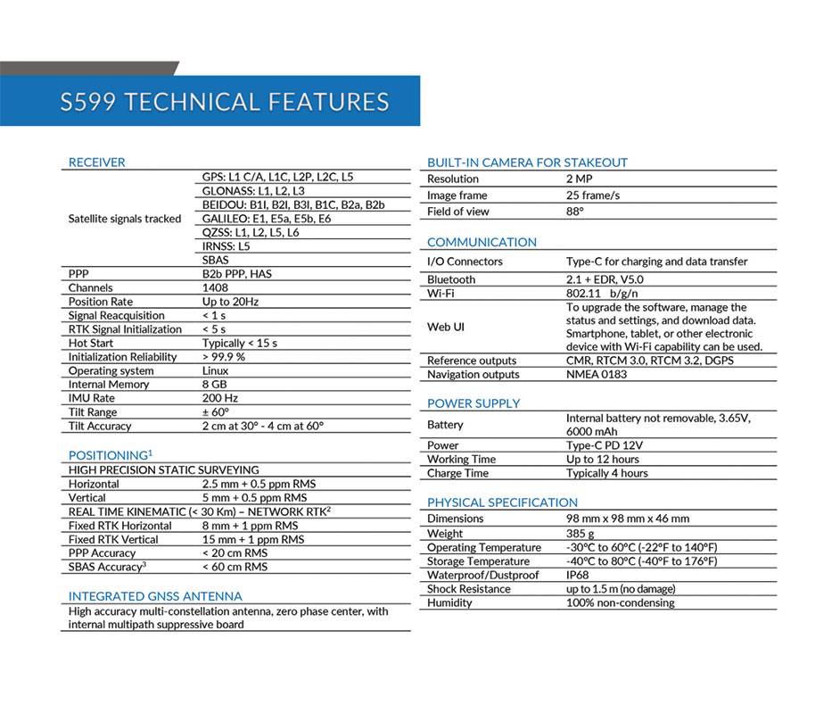 S599 uz GNSS ploču s 1408 kanala, IMU senzor za ispravljanje mjerenja s nagnutim štapom do +/-60° ima kameru za vizualno iskolčenje. Ovim načinom ubrzava se iskolčenje i do 60%. S599 na ekranu kontrolera vizualizira točku u virtualnoj stvarnosti i daje grafičke upute prema istoj. IP68 zaštita osigurava bezbrižan rad na najtežim terenima i otpornost na pad u vodu ili more do dubine 1m.