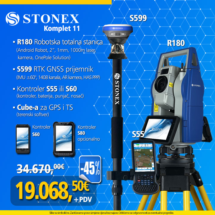 Predstavljamo ultimativno rješenje za upravljanje jednim operaterom za sve vaše geodetske potrebe: Robotska totalna stanica STONEX R180 i RTK prijemnik S599. Robotska totalna stanica STONEX R180: Sa sustavom Android i terenskim softverom Cube A, nudi neusporedivu preciznost, jednostavnost korištenja i besprijekornu integraciju podataka. Njegove robotske mogućnosti omogućuju učinkovit rad jednog čovjeka, maksimizirajući produktivnost. S599 RTK prijemnik: S vrhunskom IMU tehnologijom nagiba (u kompletu), osigurava vrlo precizno prikupljanje podataka i brzu izvedbu, čak i u izazovnim uvjetima. IMU i Ugrađena kamera za AR iskolčenje olakšavaju i ubrzavaju iskolčenje. Zajedno, robotska totalna stanica R180 i RTK prijemnik S599 čine savršeno jedinstveno rješenje, koje vam omogućuje da se uhvatite u koštac s bilo kojim geodetskim projektom brzinom i preciznošću. Doživite budućnost geodetske izmjere sa STONEX-om i pojednostavite svoj tijek rada kao nikada prije.