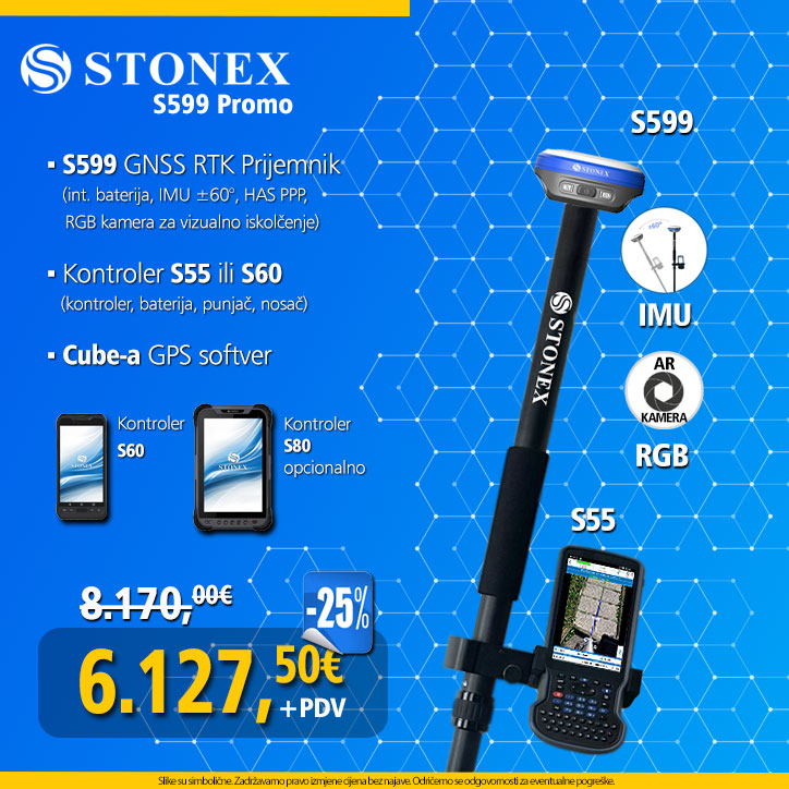 Odaberi S599 prijemnik s jednim od kontrolera i sve ostalo što ti je potrebno za rad od dodatne opreme, izostavi ono što već imaš i možeš iskoristiti. Od dodatnih opcija izaberi najpotrebnije, ili dodaj pribor ili aktivaciju Total station u kontroleru. Na svu dodatnu opremu i opcije popust je -25%.