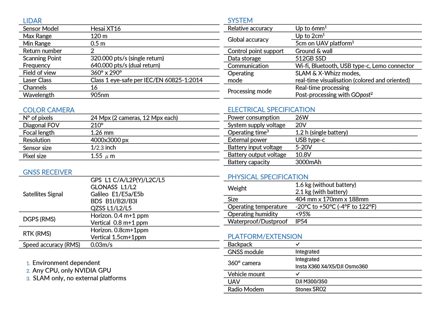 Integriran RTK GNSS prijemnik i dvije RGB panoramske kamere visoke rezolucije (24MP). Po potrebi automatski snima kontrolne točke. X-WHIZZ mod koji omogućuje sjedinjavanje mobilnog i statičkog skeniranja. Izmjenjiva baterija integrirana u ručki skenera.